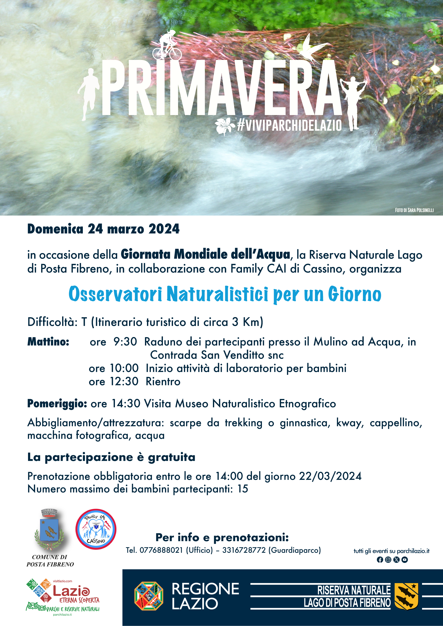 Domenica 24 marzo 2024, allo scopo di ricordare questa importante ricorrenza, la Riserva Naturale Lago di Posta Fibreno, organizza, in collaborazione con il Family CAI di Cassino, “OSSERVATORI NATURALISTICI PER UN GIORNO”.
