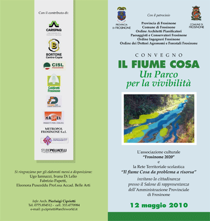 Mercoledì 12 maggio 2010 a partire dalle ore 9.30 presso il salone di rappresentanza dell'Amministrazione Provinciale di Frosinone si terrà il convegno "Il Fiume Cosa - Un Parco per la vivibilità" organizzato dall'Associazione Culturale "Frosinone 2020" e la Rete Territoriale Scolastica "Il Fiume Cosa da problema a risorsa". Al convegno sarà presente Vito Consoli, direttore dell'ARP, con un intervento dal titolo "Confrontarsi con i vincoli".