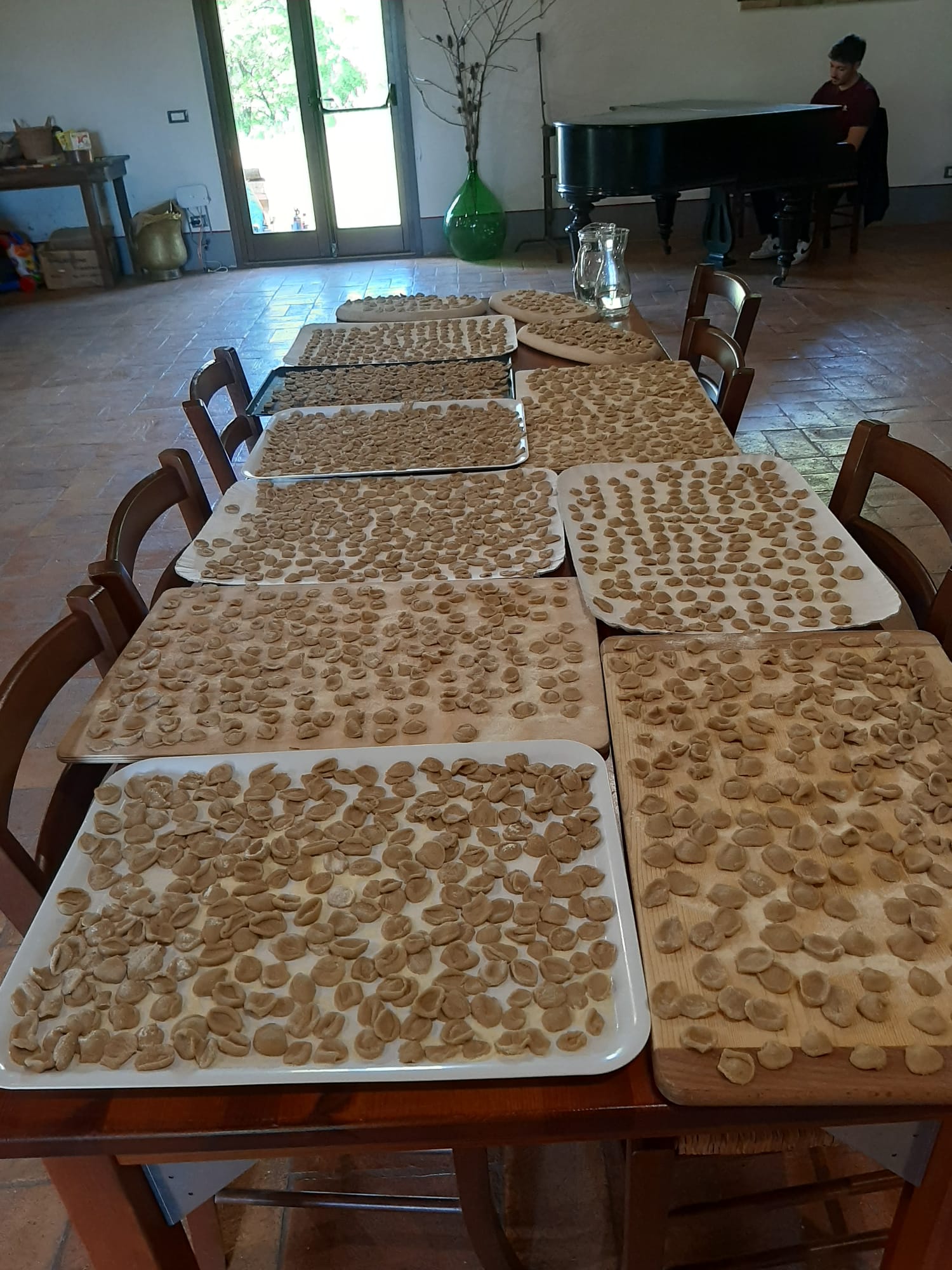 Oggi voglio soffermarmi sull’ultima parte del nostro viaggio, quella dedicata al cibo che possiamo trovare in natura, le erbe spontanee in particolar modo, ma anche frutti e fiori, che possono dare varietà alla nostra dieta a volte troppo standardizzata e arricchirla, perché i cibi selvatici sono più saporiti, più nutrienti e vanno conosciuti, cercati e raccolti prima di poterli mangiare. Questo abbiamo fatto la settimana scorsa, accolti e messi al lavoro da Marco e Chiara Carbonara, titolari della Fattoria rigenerativa Pulicaro, oasi di bellezza e attività agricole e agrituristiche presso Torre Alfina. Forti delle pregresse conoscenze teoriche sviluppate in classe abbiamo intrapreso una ricerca delle erbe primaverili che poi abbiamo usato, insieme ad altri ingredienti provenienti dall’azienda, per realizzare il nostro pranzo. Quindi, mentre alcuni raccoglievano margherite, farinello, cicoria, vitalba, carota selvatica, finocchio selvatico, malva, melissa, menta, piantaggine, rosmarino, rovo, romice, silene, grespino, cardo mariano, tarassaco, ombrellini pugliesi e bietola selvatica, altri impastavano e realizzavano a mano le orecchiette, apparecchiavano e infine cucinavamo un pasto così composto: bruschette con lardo del Pulicaro, orecchiette con pesto di erbe selvatiche e un assaggio alla “macchiaiola”, con erbe aromatiche e peperoncino, una straordinaria frittata cotta in forno a base di uova dell’azienda e ancora erbe selvatiche. Un menu per nulla banale, semplice ma non troppo, e di grande soddisfazione!
