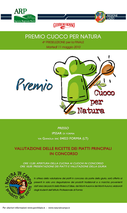 Martedì 11 maggio alle ore 18.00 presso l'IPSSAR di Formia (via Gianola snc) si svolgerà la quarta prova del concorso Cuoco per Natura. La serata sarà dedicata alla valutazione delle ricette dei piatti principali. Alle ore 12.00 ci sarà l'apertura della cucina ai cuochi in concorso e alle ore 18.00 i piatti verranno presentati alla giuria. Ai presenti in sala, in attesa della valutazione dei piatti da parte della giuria, verrà offerta una degustazione dei prodotti tipici tradizionali dei parchi di Riviera di Ulisse, Monti Ausoni e Lago di Fondi e Monti Aurunci, elaborati dagli studenti dell'istituo professionale di Formia. Tutti gli altri cuochi che hanno inviato le loro ricette possono assistere all'evento confermando la propria partecipazione all'organizzazione. I cuochi ammessi a partecipare a questa prova sono: Francesco Capirchio; Daniela Di Grazia; Laura Dorelli; Giacomo Lepri; Sara Masini; Jvan Tenan. vai al sito dell'IPSSAR di Formia