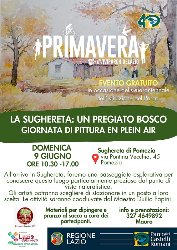 Domenica 9 giugno dalle ore 10.00 alle 17.00, appuntamento con una giornata di pittura en plein air, con l’evento “La Sughereta: un pregiato bosco”, a cura dell’associazione ‘In Labore Fructus Aps’. Una passeggiata esplorativa per conoscere questo luogo particolarmente prezioso dal punto di vista naturalistico, dove gli artisti potranno scegliere un posto nel quale stazionare per comporre le loro opere.