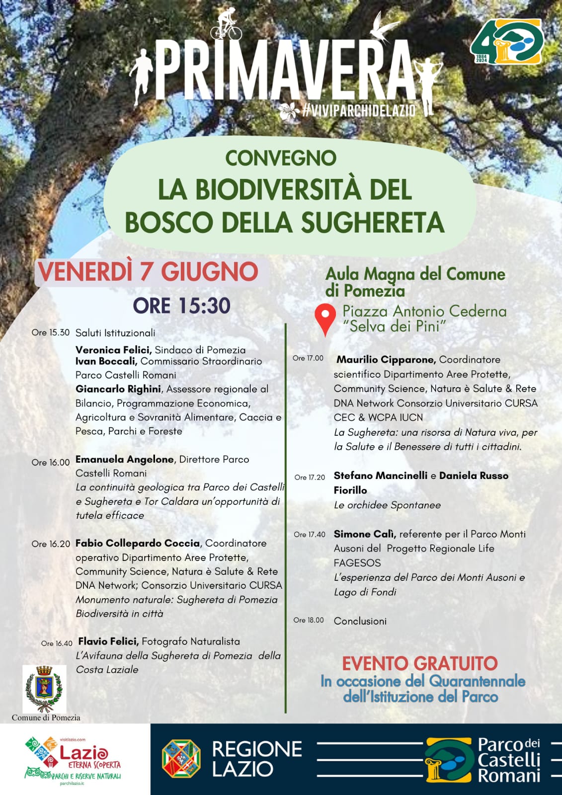 Venerdì 7 giugno alle ore 15.30, si svolgerà presso l'Aula Magna del Comune di Pomezia (RM), il convegno: "La biodiversità del bosco della Sughereta". L'evento è gratuito, nella locandina allegata, il programma dettagliato con la scaletta degli interventi.
