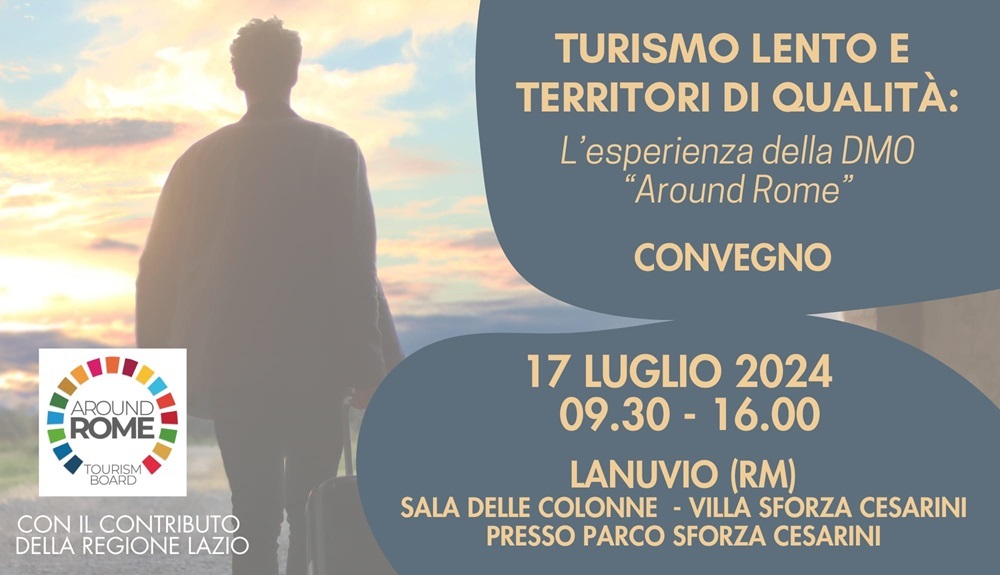 Mercoledì 17 luglio, dalle ore 9.30 alle 17.30, si svolgerà presso la Sala delle Colonne di Villa Sforza Cesarini a Lanuvio (RM), il convegno “Turismo lento e territori di qualità: l’esperienza della DMO (Destination Management Organization) “Around Rome”.