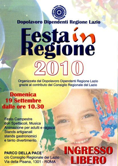 Domenica 19 Settembre 2010 alle ore 10.30 presso il Parco della Pace in Via della Pisana, 1301 (Roma) (adiacente alla sede del Consiglio Regionale), il Dopolavoro dei dipendenti Regione Lazio, organizza la manifestazione "Festa in Regione 2010" con spettacoli, musica, animazione per adulti e ragazzi, stand gastronomici e artigianali. L'Agenzia parteciperà con un proprio stand.