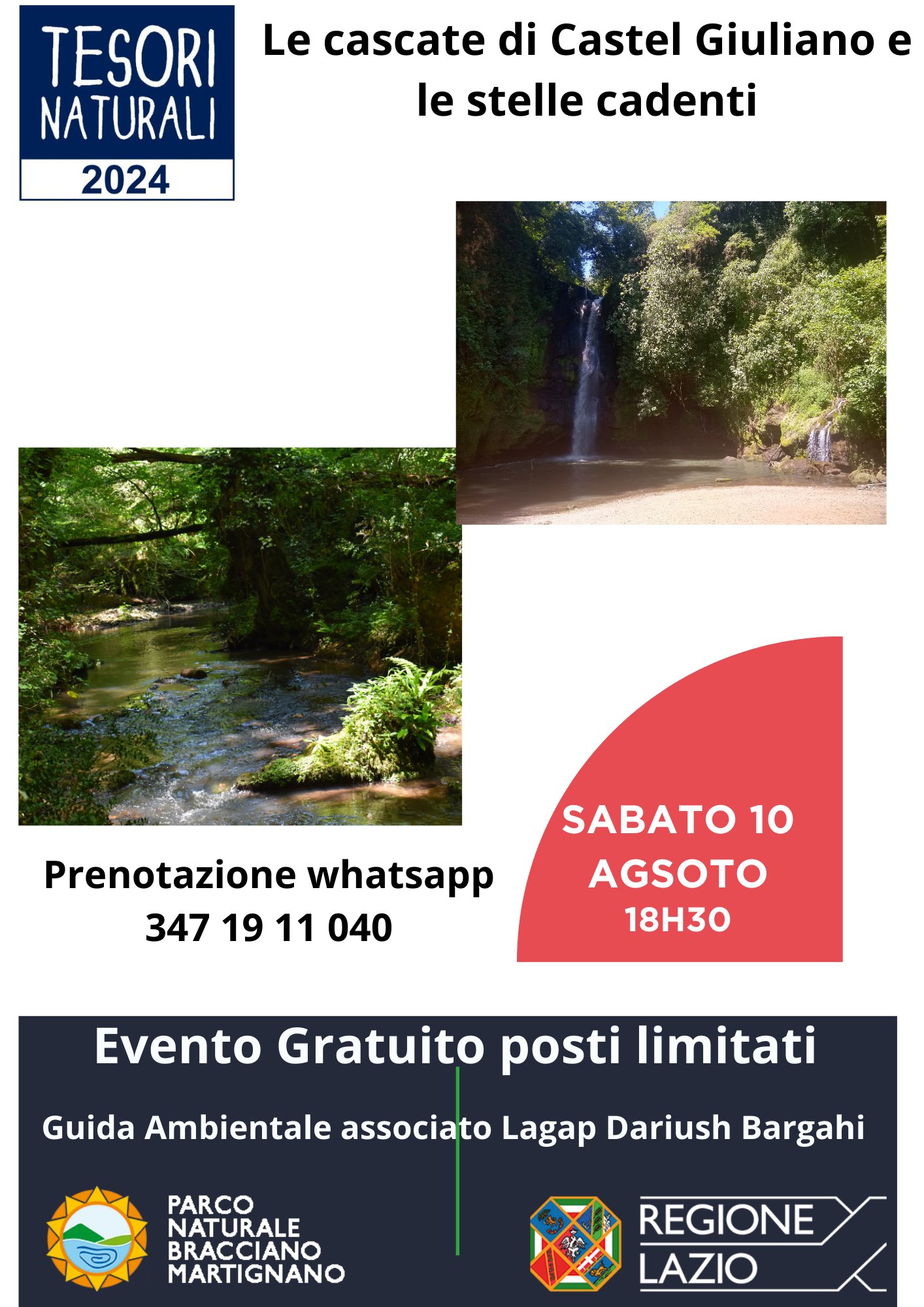 Partendo da Castel Giuliano, nel tardo pomeriggio estivo, andremo alla ricerca delle due cascate di Castel Giuliano. Lungo ii fosso della Mola scopriremo queste cadute formate dal torrente e vedremo i resti di antiche ferriere. Faremo una sosta per la cena e ritorneremo al punto di partenza con gli occhi in alto al cielo nella notte delle stelle cadenti.