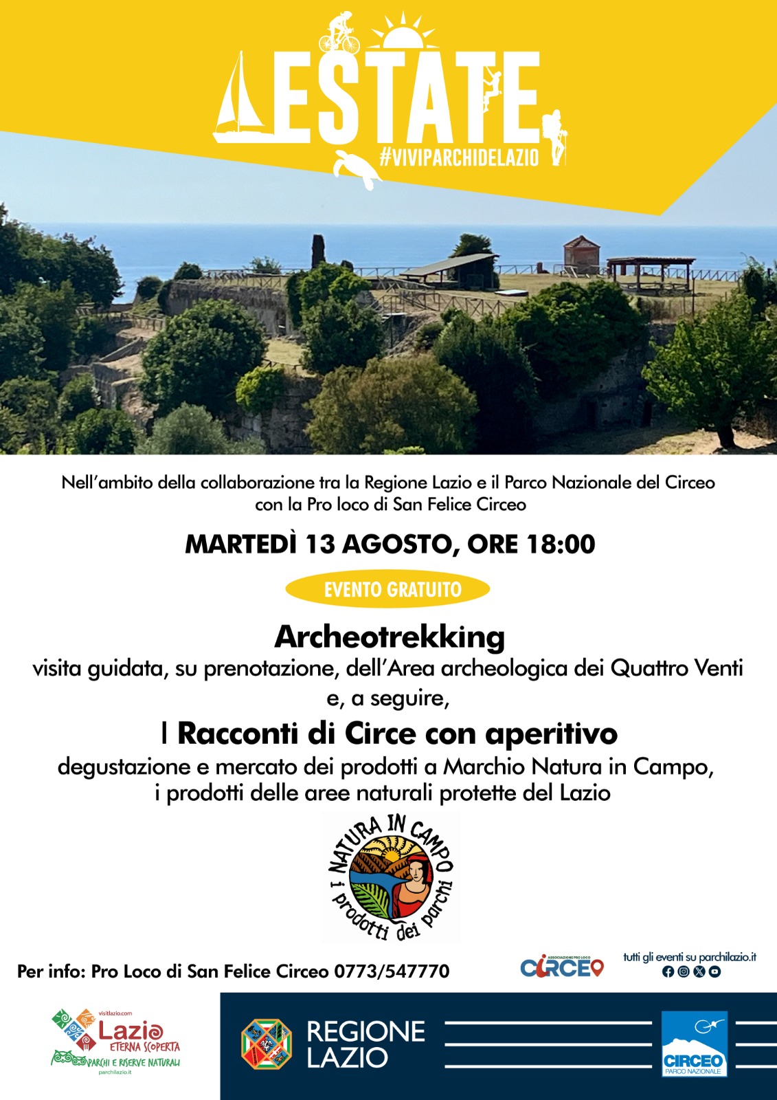 Visita guidata, su prenotazione, dell’area archeologica dei Quattro Venti e, a seguire, i Racconti di Circe con aperitivo: degustazione e mercato dei prodotti a marchio Natura in Campo, i prodotti delle aree naturali protette del Lazio.