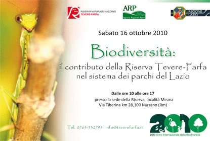 Sabato 16 ottobre 2010 presso la sede della Riserva Nazzano, Tevere-Farfa, in località Meana Via Tiberina km 28,100 Nazzano (Rm), si terrà il convegno dal titolo “Biodiversità: il contributo della Riserva Tevere-Farfa nel sistema dei parchi del Lazio”. L’Agenzia Regionale Parchi parteciperà al convegno con il contributo di quattro esperti naturalisti che interverranno sulle tematiche inerenti la biodiversità.