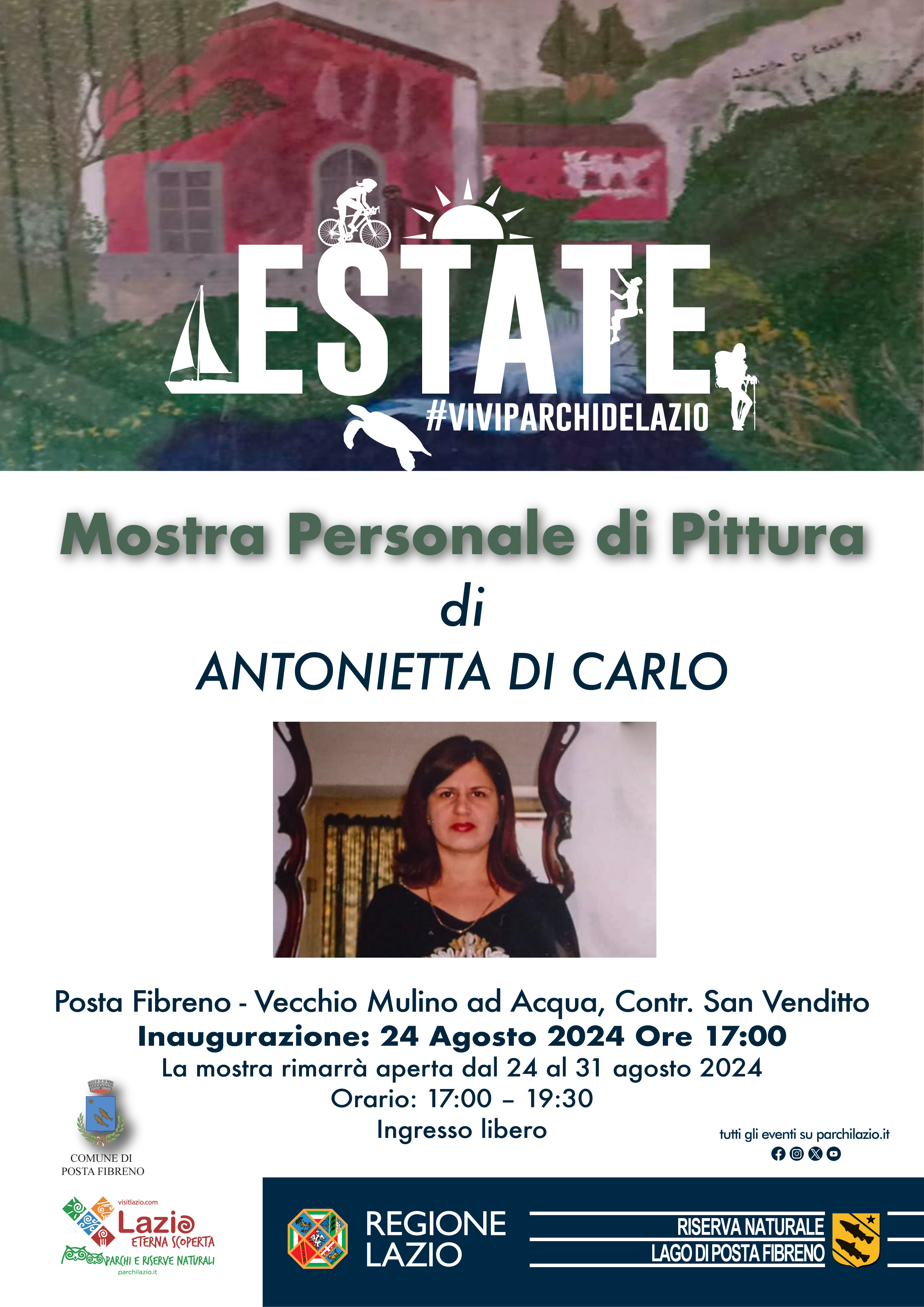 Sabato 24 agosto 2024 alle ore 17:00 si terrà, presso il Vecchio Mulino ad Acqua, sito a Posta Fibreno in Contrada San Venditto snc, l’inaugurazione della personale di pittura di Antonietta Di Carlo.