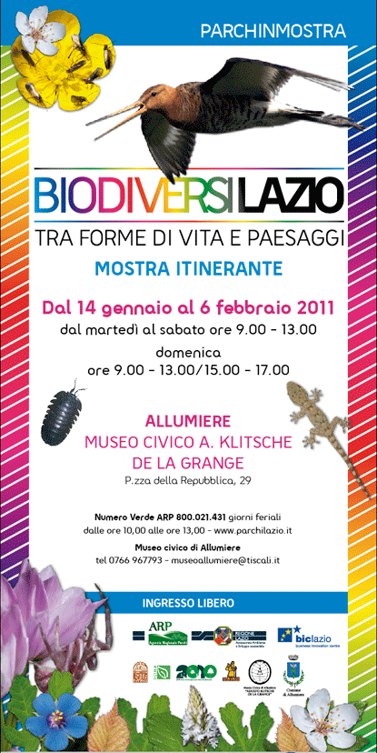 Dal 14 gennaio 2011 la mostra "BiodiversiLazio", che illustra attraverso reperti, testi, immagini e giochi il patrimonio di biodiversità custodite nel territorio della nostra regione, si sposta al museo civico "A. Klitsche De La Grange" di Allumiere (p.zza della Repubblica, 29). Sarà possibile visitare la mostra fino al 6 febbraio 2011 dal martedì al sabato dalle 9.00 alle 13.00 e la domenica dalle 9.00 alle 13.00 e dalle 15.00 alle 17.00. L'inaugurazione si terrà il 19 gennaio alle ore 11.00.