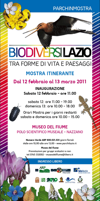 In occasione del Festival della Biodiversità mostra "BiodiversiLazio" si sposta al Museo del Fiume di Nazzano (RM). L’inaugurazione si terrà il 12 febbraio alle ore 11.00 mostra sarà aperta secondo i seguenti orari: sabato 12 dalle 10.00 alle 19.00 e domenica 13 dalle 10.00 alle 18.00. Fino al 13 marzo la mostra è visitabile ogni sabato e domenica dalle 10.00 alle 15.00. Saranno possibili aperture straordinarie per gruppi e scolaresche (per info tel. 0765332002).