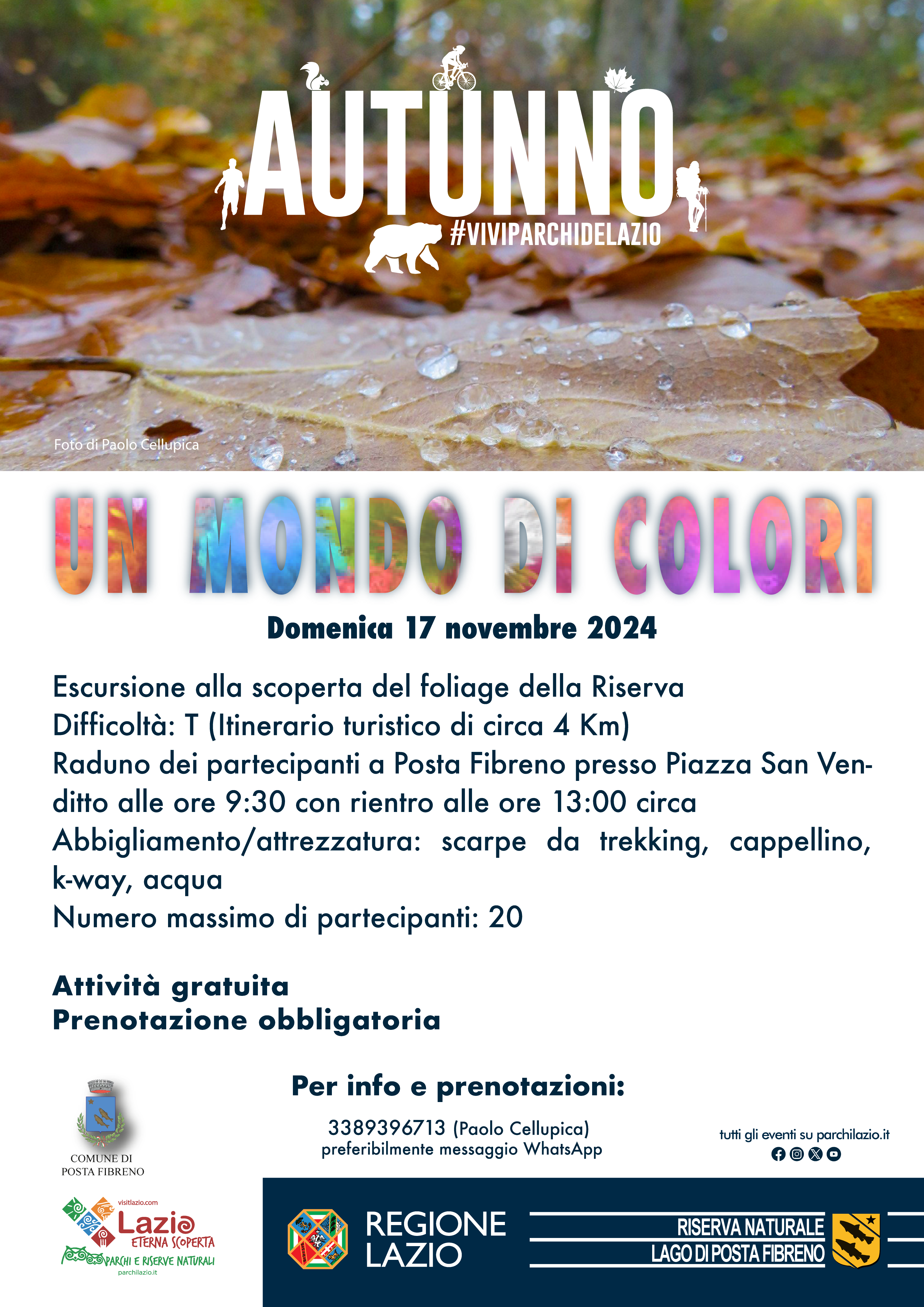 Domenica 17 novembre 2024, la Riserva Naturale lago di Posta Fibreno organizza “Un Mondo di Colori”, escursione alla scoperta della magica atmosfera e dei caldi colori del bosco in autunno.