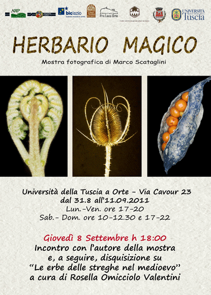 Dal 31 agosto all’11 settembre 2011 la mostra fotografica Herbario Magico di Marco Scataglini sarà ospitata all’Università della Tuscia a Orte in via Cavour, 23. Giovedì 08 settembre alle ore 18.00 si terrà un incontro con l’autore della mostra e, a seguire, ci sarà una discussione sulle “Erbe delle streghe nel medioevo” a cura di Rosella Omicciolo Valentini. La mostra sarà visitabile nei seguenti orari: dal lunedì al venerdì dalle 17.00 alle 20.00 sabato e domenica dalle ore 10.00 alle 12.30 e dalle 17.00 alle 22.00