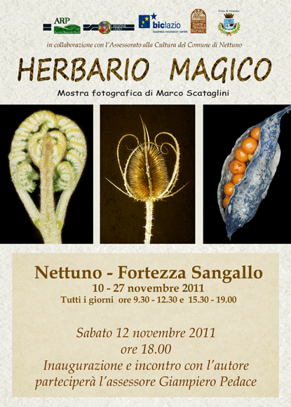 Dal 10 al 24 novembre 2011 la mostra fotografica Herbario Magico di Marco Scataglini sarà ospitata al Forte Sangallo a Nettuno . La mostra sarà visitabile tutti i giorni dalle 9.30 alle 12.30 e dalle 15.30 alle 19.00. Sabato 12 novembre alle ore 18.00 l’autore e l’Assessore Giampiero Pedace saranno presenti per l'inaugurazione della mostra.