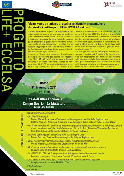 Si svolgerà a Roma il 14 dicembre 2011, dalle ore 10.00, presso la Città dell'Altra Economia (Campo Boario-Ex Mattatoio), Largo Dino Frisullo, il Convegno "Viaggi verso un turismo di qualità ambientale: presentazione dei risultati del progetto Life+ Eccelsa nel Lazio". L'Agenzia Regionale Parchi ha partecipato al progetto insieme all'Ente Parco Castelli Romani, prendendo parte al Comitato Promotore "Ambito Produttivo Omogeneo Castelli Romani" per promuovere il Cluster Turistico del Parco Regionale Castelli Romani.