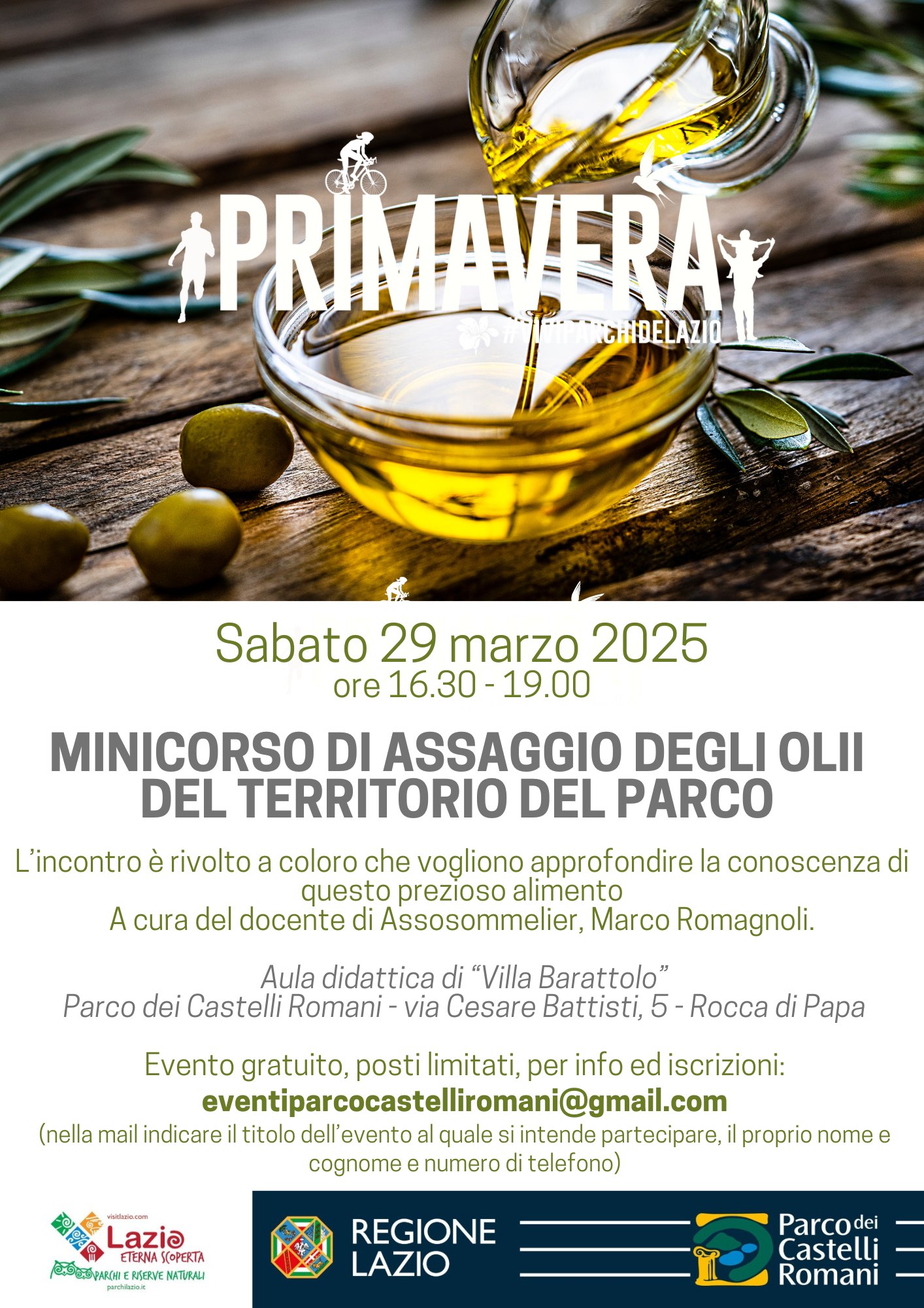 Sabato 29 marzo 2025 dalle ore 16.30 alle ore 19.00, presso Villa Barattolo, sede del Parco dei Castelli Romani a Rocca di Papa (RM), si svolgerà il "Minicorso di assaggio degli olii del territorio del Parco", a cura del docente di Assosommelier, Marco Romagnoli.