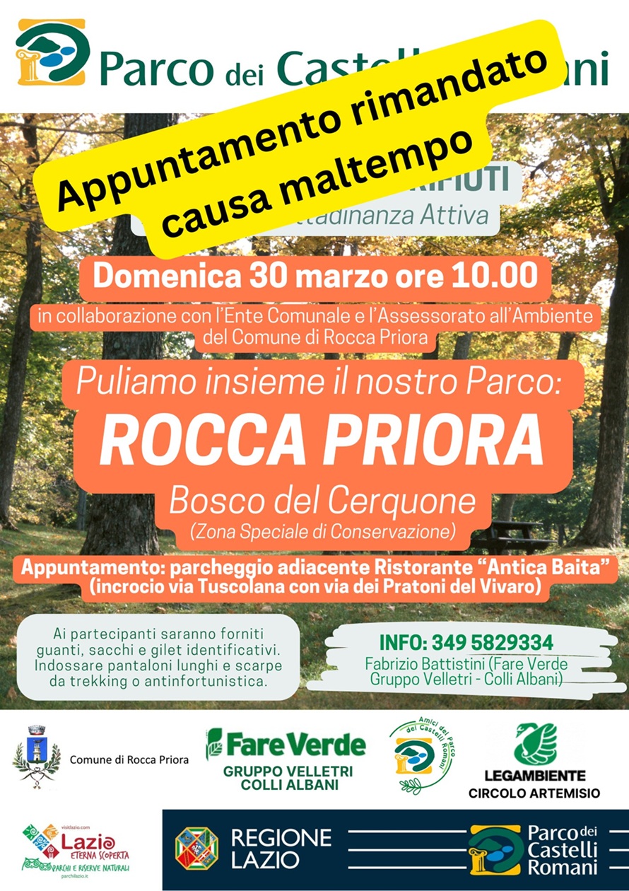 Le associazioni capofila “Fare Verde Velletri - Colli Albani” e “Legambiente Circolo Artemisio”, insieme alle “Associazioni Amiche del Parco”, provvederanno alla rimozione dei rifiuti dalla zona del bosco del Cerquone nel comune di Rocca Priora (RM). L’appuntamento è alle ore 10.00, al parcheggio adiacente il ristorante “Antica Baita” – incrocio via Tuscolana con via Pratoni del Vivaro.