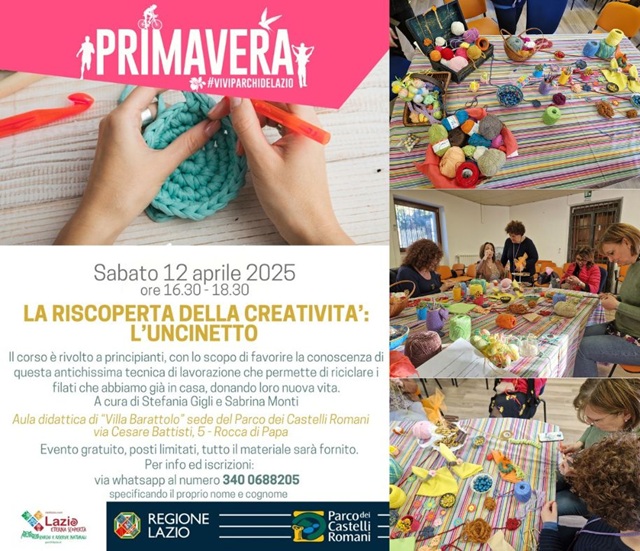Sabato 12 aprile, presso l’aula didattica di “Villa Barattolo”, sede del Parco dei Castelli Romani a Rocca di Papa (RM), si svolgerà dalle ore 16.30 alle ore 18.30, il secondo appuntamento del corso di uncinetto.