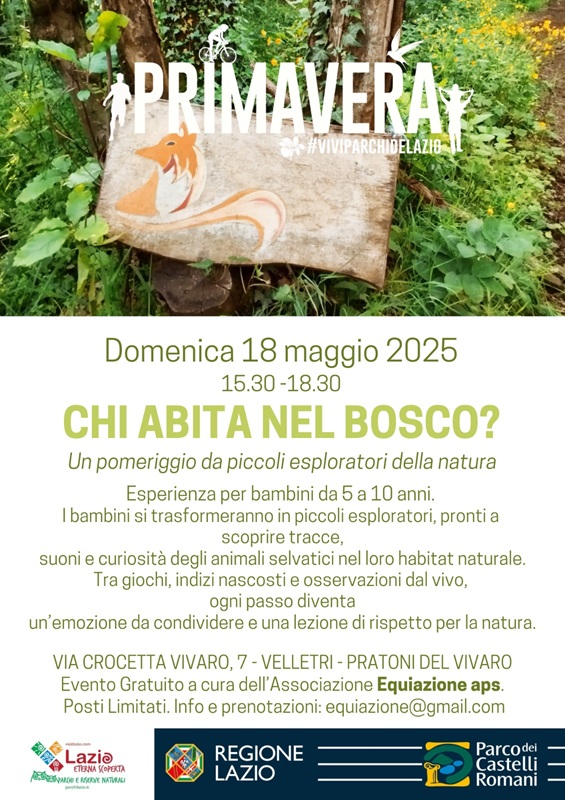 Domenica 18 maggio dalle ore 15.30 alle 18.30, si svolgerà l’iniziativa “Chi Abita nel Bosco?”. Un’esperienza per bambini dai 5 ai 10 anni, per trascorrere un pomeriggio da piccoli esploratori della natura, alla scoperta di tracce, suoni e curiosità degli animali selvatici nel loro habitat naturale.