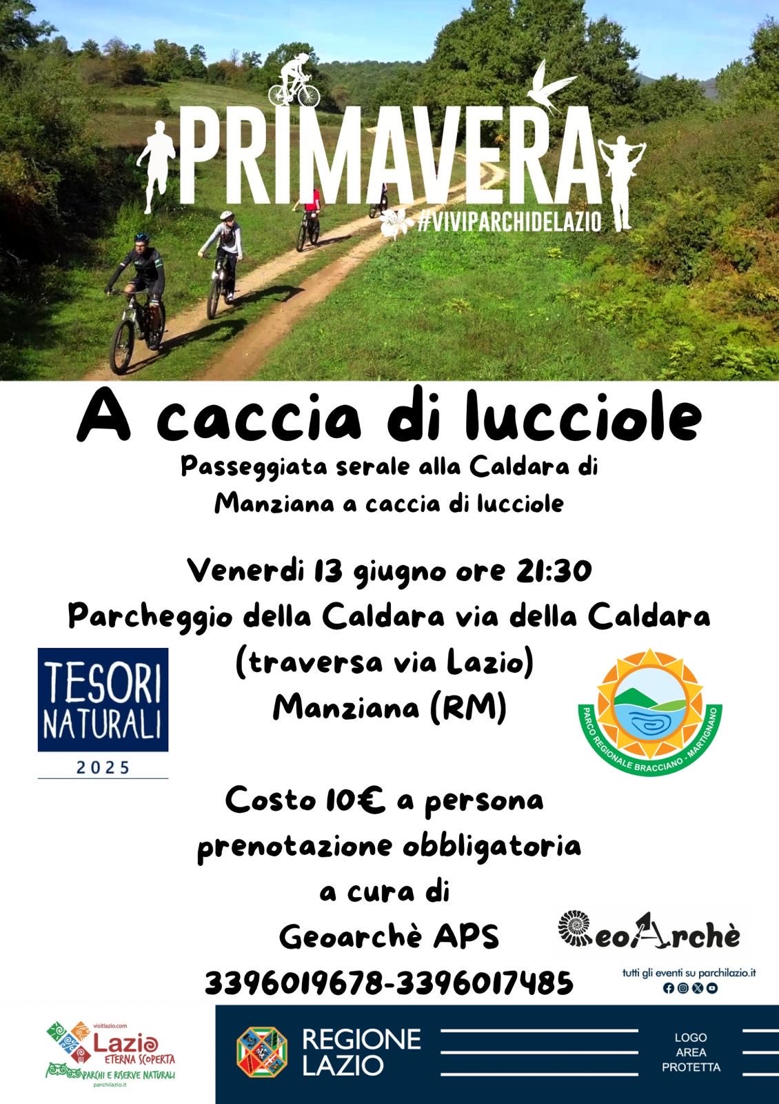 Passeggiata all’interno del sito Monumento Naturale Regionale La Caldara di Manziana, con iniziale spiegazione geologica dell’area , arricchito da leggende del posto, infine ci si sposterà verso il boschetto di betulle alla ricerca delle lucciole (si consiglia di portare torcia o frontalino, antizanzare INDISPENSABILE e un giacchetto per l’umidità)