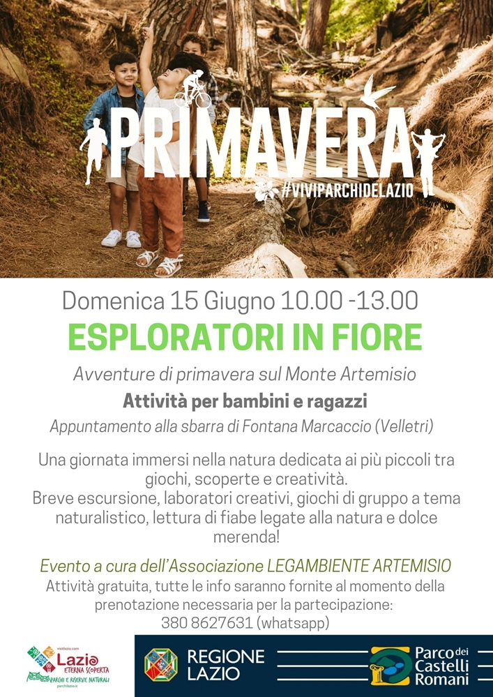 Domenica 15 giugno dalle ore 10.00 alle 13.00, si svolgerà l’attività gratuita per bambini e ragazzi a cura del "Circolo Legambiente Artemisio”. L’appuntamento è presso la sbarra di Fontana Marcaccio a Velletri (RM). Sarà una giornata dedicata ai più piccoli, tra giochi, scoperte e creatività. Tutte le informazioni sono disponibili nella locandina allegata.