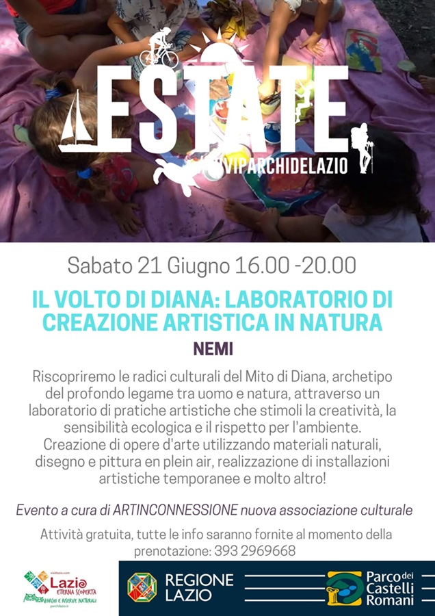 Sabato 21 giugno appuntamento dalle ore 16.00 alle 20.00, con l’attività gratuita “Il Volto di Diana: Laboratorio di creazione artistica in Natura”, a cura della nuova associazione culturale “Artinconnessione”.