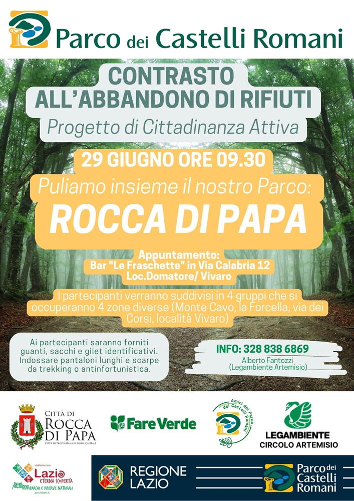 Per tutti coloro che aderiranno all’iniziativa, l’appuntamento è per le ore 9.30, in via Calabria, 12 – Loc. Domatore/Vivaro a Rocca di Papa (RM). I partecipanti divisi in quattro gruppi si occuperanno di bonificare quattro zone diverse: Monte Cavo, la Forcella, via dei Corsi (loc. Vivaro), come da indicazioni riportate nella locandina allegata.