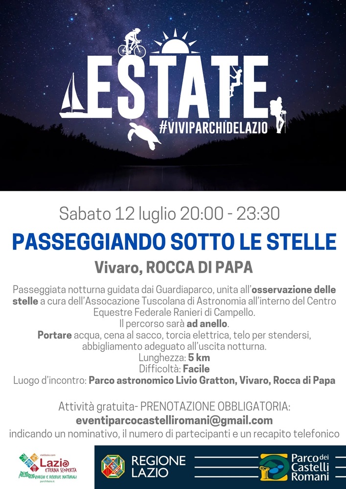 Sabato 12 luglio dalle ore 20.00 alle 23.30, si svolgerà all’interno del centro equestre ‘Ranieri di Campello’, una passeggiata notturna guidata dai Guardiaparco, unita all’osservazione delle stelle a cura dell’Associazione Tuscolana di Astronomia (ATA).