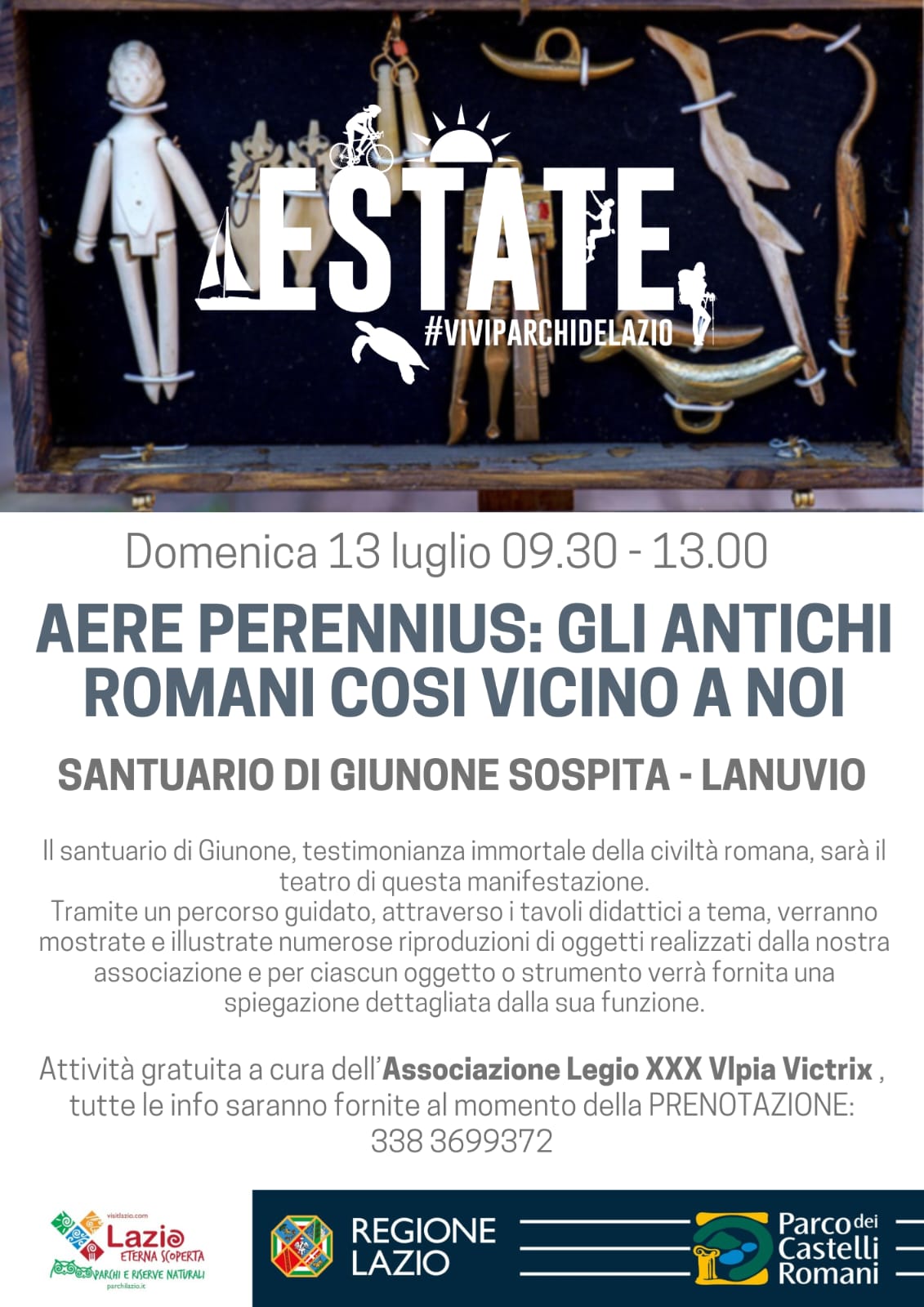 Domenica 13 luglio dalle 9.30 alle 13.00, l’Associazione ‘Legio XXX Vlpia Victrix’ ci dà appuntamento presso il Santuario di Giunone Sospita a Lanuvio (RM), per un percorso guidato attraverso i tavoli didattici a tema.