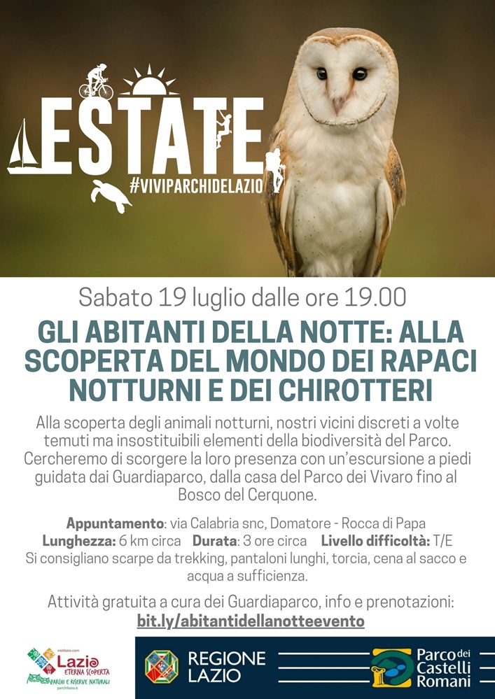 Si partirà dalla casa del Parco - via Calabria snc, Domatore - Rocca di Papa (RM), per un’escursione a piedi dal Vivaro fino al bosco del Cerquone, alla scoperta degli animali notturni, nostri vicini discreti, a volte temuti, ma insostituibili elementi della biodiversità del Parco. Tutti i dettagli sono disponibili nella locandina allegata.