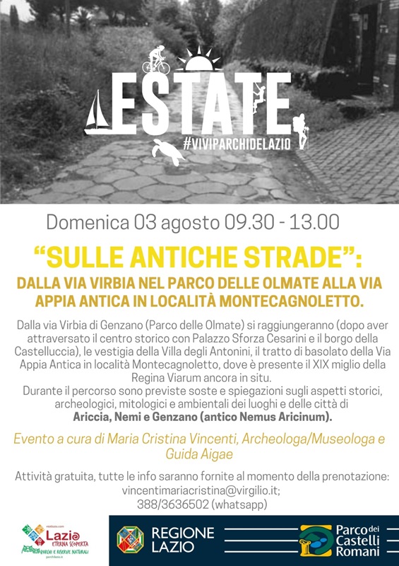 Partendo dalla via Virbia di Genzano di Roma (Parco delle Olmate), si attraverserà il centro storico con Palazzo Sforza Cesarini, il borgo della Castelluccia, le vestigia della Villa degli Antonini, fino al tratto di basolato della Via Appia Antica in località Montecagnoletto, dove è presente il XIX miglio della ‘Regina Viarum’ ancora in situ. Tutti i dettagli sono disponibili nella locandina allegata.