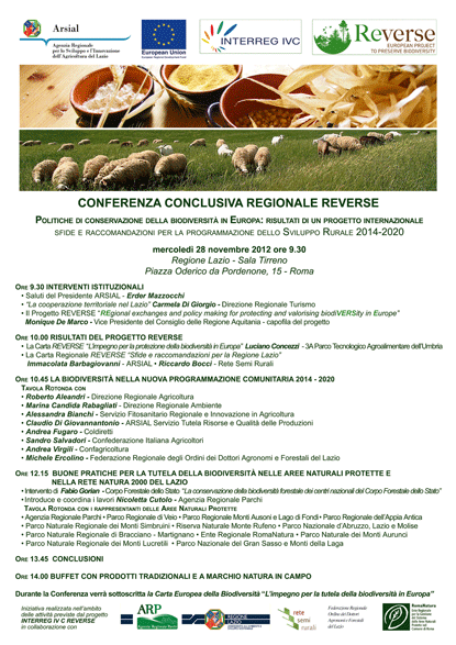Mercoledì 28 novembre 2012 alle ore 9,30 presso la sala Tirreno della Regione Lazio si terrà la “Conferenza conclusiva regionale Progetto REVERSE - Politiche di conservazione della biodiversità in Europa”. Produzione agricola, conservazione del paesaggio, tutela delle risorse naturali, vocazione turistica dei territori, quattro aspetti cruciali per il futuro delle aree rurali europee e un denominatore comune: la conservazione e la valorizzazione della biodiversità. L' Agenzia Regionale per lo Sviluppo e l'Innovazione dell'Agricoltura del Lazio (ARSIAL) e l'Agenzia Regionale Parchi (ARP), presentano i risultati del programma congiunto di iniziative per la diffusione di buone pratiche per la conservazione della biodiversità nelle aree protette della Regione Lazio nell'ambito del progetto europeo REVERSE (REgional exchanges and policy making for protecting and valorizing biodiVERSity in Europe). L'ARP ha partecipato al progetto REVERSE proponendo tre “buone pratiche” scelte fra i programmi e i progetti avviati e sperimentati da tempo nelle aree protette regionali: Natura in Campo, Natura in Viaggio, con il progetto “Le Strade dei Parchi”, e ParchinMostra. Queste buone pratiche sono presenti nel volume “ENHANCING BIODIVERSITY AND BOOSTING ECONOMIC DEVELOPMENT” realizzato a conclusione del progetto REVERSE.