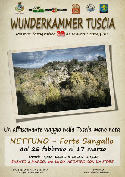 Mostra fotografica di Marco Scataglini "Wunderkammer Tuscia". La mostra è frutto di un lungo lavoro di esplorazione della Tuscia, interamente in 3D. raccoglie circa 30 immagini (più diversi "extra") di località scelte tra le circa 100 che sono state oggetto della ricerca dell'Autore. La tecnica adottata è quella dell'anaglifo, che va osservato grazie all'utilizzo di occhialini con lenti ciano/rosso, in modo da avere un adeguato effetto stereoscopico. In occasione dell'inaugurazione ci sarà una proiezione, con fotografie che rappresentano alcuni dei luoghi più significativi tra quelli illustrati nella mostra, tra cui numerose immagini QTVR, cioè panoramiche immersive che consentono allo spettatore di provare quasi la sensazione di essere sul posto e di potersi guardare intorno. Da martedì 26 febbraio a domenica 17 marzo, la mostra è visitabile presso Nettuno - Forte Sangallo la mattina dalle ore 9.30 - 12.30 e il pomeriggio dalle ore 15.30 - 19.00. Sabato 2 marzo alle ore 18.00 incontro con l'autore Marco Scataglini.