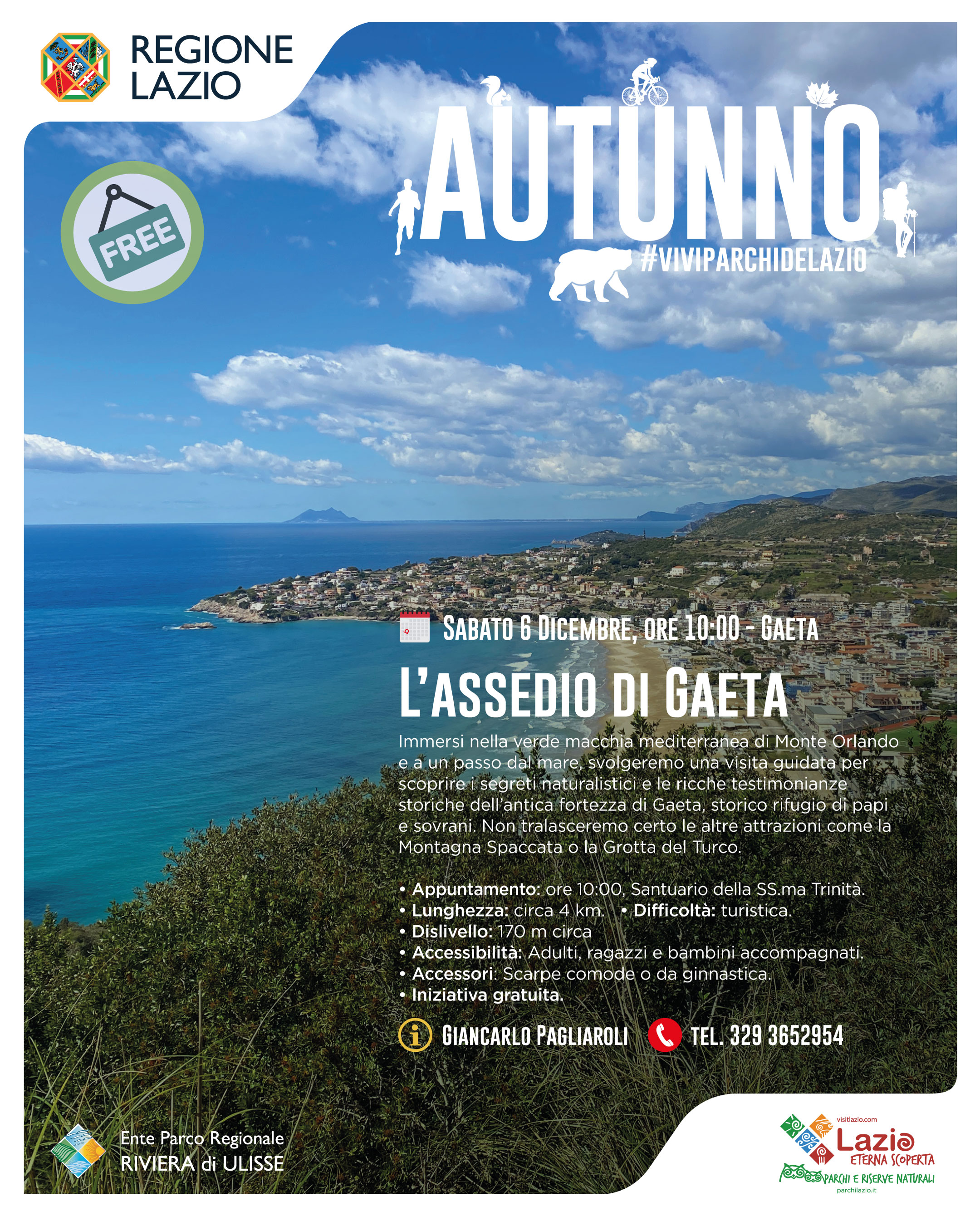 Immersi nella verde macchia mediterranea di Monte Orlando e a un passo dal mare, svolgeremo una visita guidata per scoprire i segreti naturalistici e le ricche testimonianze storiche dell’antica fortezza di Gaeta, storico rifugio di papi e sovrani. Non tralasceremo certo le altre attrazioni come la Montagna Spaccata o la Grotta del Turco.