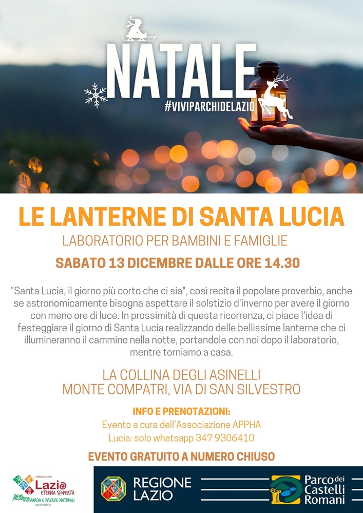 Sabato 13 dicembre a partire dalle ore 14.30, si svolgerà presso “La Collina degli Asinelli” a Monte Compatri (RM), il laboratorio per bambini e famiglie in cui si celebrerà il giorno più corto dell’anno attraverso la realizzazione delle “Lanterne di Santa Lucia”, che illumineranno il cammino nella notte, tornando a casa. L’evento a cura dell’associazione’ Appha’ è gratuito e a numero chiuso. Tutti i dettagli dell'iniziativa sono disponibili nella locandina allegata.