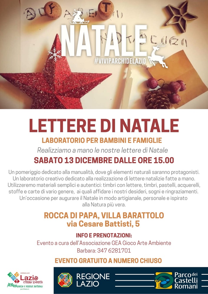 Sabato 13 dicembre alle ore 15.00 presso Villa Barattolo, sede del Parco dei Castelli Romani a Rocca di Papa (RM), l’associazione GEA – Gioco Arte Ambiente, accoglierà i bambini per un laboratorio natalizio, dove gli elementi naturali saranno i protagonisti, per la realizzazione di lettere di Natale fatte a mano. Un’occasione per augurare il Natale in modo artigianale, personale e ispirato alla natura più vera. Tutti i dettagli dell'iniziativa sono disponibili nella locandina allegata.