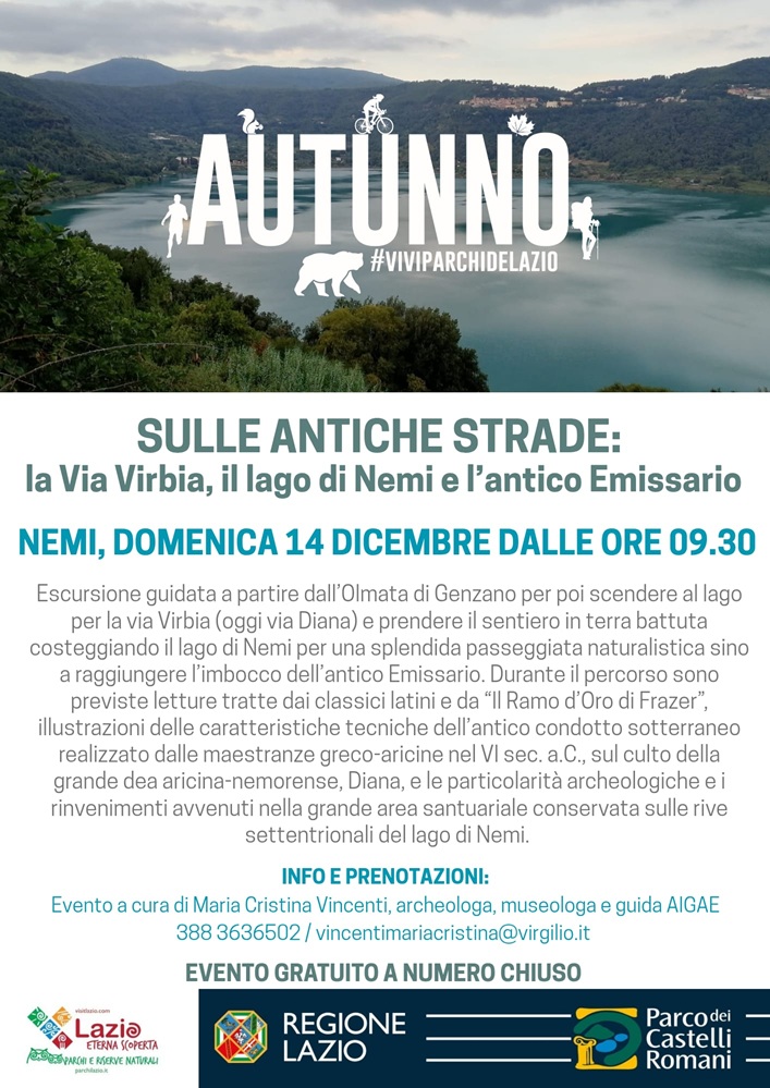 Domenica 14 dicembre dalle ore 9.30, l’archeologa Maria Cristina Vincenti ci accompagnerà in un’escursione gratuita che dall’Olmata di Genzano di Roma, scende per la Via Virbia, (oggi Via Diana), per prendere il sentiero in terra battuta che costeggia il lago di Nemi. Una passeggiata naturalistica che ci condurrà fino all’imbocco dell’antico Emissario. Durante il percorso sono previste letture e spiegazioni storico-archeologiche arricchite da illustrazioni. Tutti i dettagli dell'iniziativa sono disponibili nella locandina allegata.