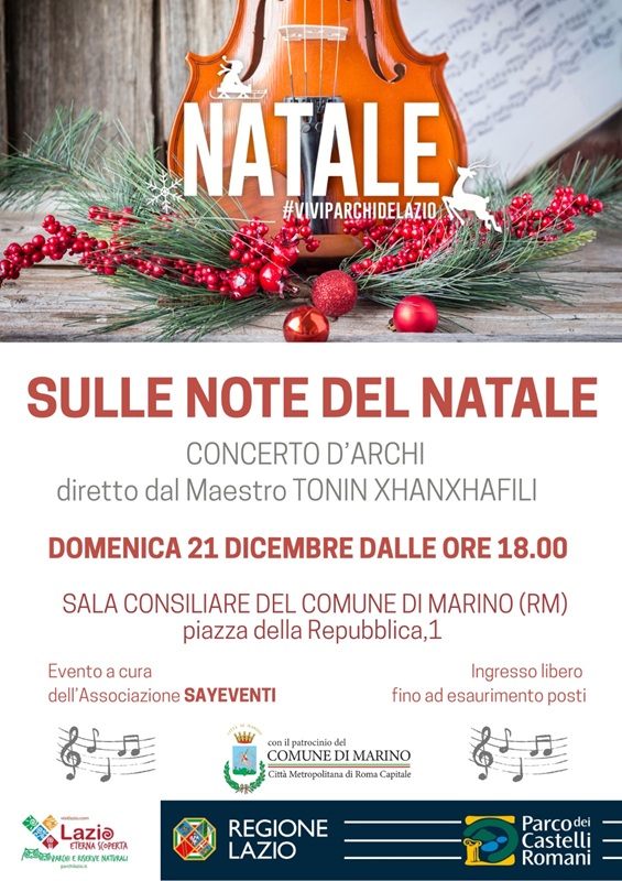 Il Parco dei Castelli Romani è lieto di invitarvi al concerto d’archi “Sulle Note del Natale”, che si svolgerà domenica 21 dicembre alle ore 18.00, presso la Sala Consiliare del comune di Marino (RM).