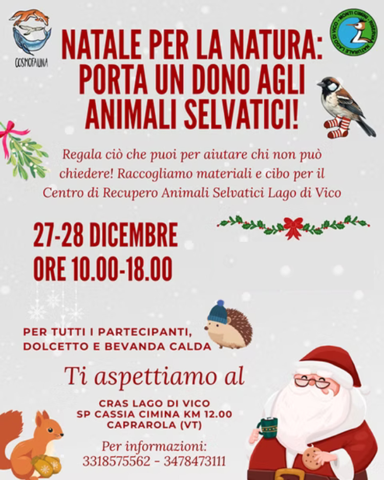 Nelle giornate del 27 e 28 dicembre, dalle ore 10.00 alle ore 18.00, l'Associazione Cosmofauna organizza una raccolta straordinaria di materiale utile alle attività del CRAS - Centro Recupero Animali Selvatici attivo da quasi quarant'anni presso la sede dell'Ente Monti Cimini - Riserva Naturale Lago di Vico.