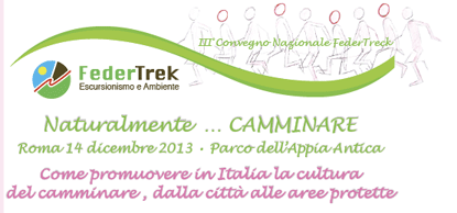 Sabato 14 dicembre presso la sala conferenze del Parco dell’Appia Antica, via appia antica, 42 Roma, dalle ore 9.30 alle ore 19.00 si svolgerà il III Convegno Nazionale di FederTrek “Naturalmente …Camminare”. L’obiettivo del convegno è quello di diffondere e promuovere la cultura del camminare, i suoi valori e la sua centralità rispetto alla socialità, il benessere, la tutela ambientale e lo sviluppo di un turismo consapevole e sostenibile. Il Direttore dell’ARP Vito Consoli prenderà parte alla tavola rotonda “Come promuovere la cultura del camminare, dalla città alle Aree Protette”, prevista per le ore 17.30.