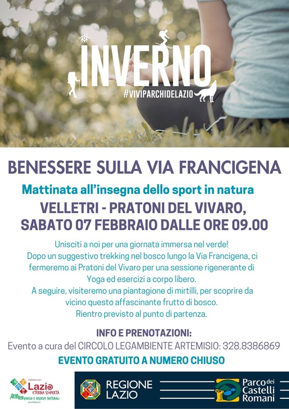 Sabato 7 febbraio, per tutti gli appassionati di sport in natura, l’appuntamento è dalle ore 9.00 ai Pratoni del Vivaro per una giornata immersi nel verde, in compagnia del Circolo Legambiente Artemisio di Velletri. Dopo un trekking nel bosco lungo la Via Francigena, si svolgerà una sessione di rigenerante di Yoga ed esercizi a corpo libero.