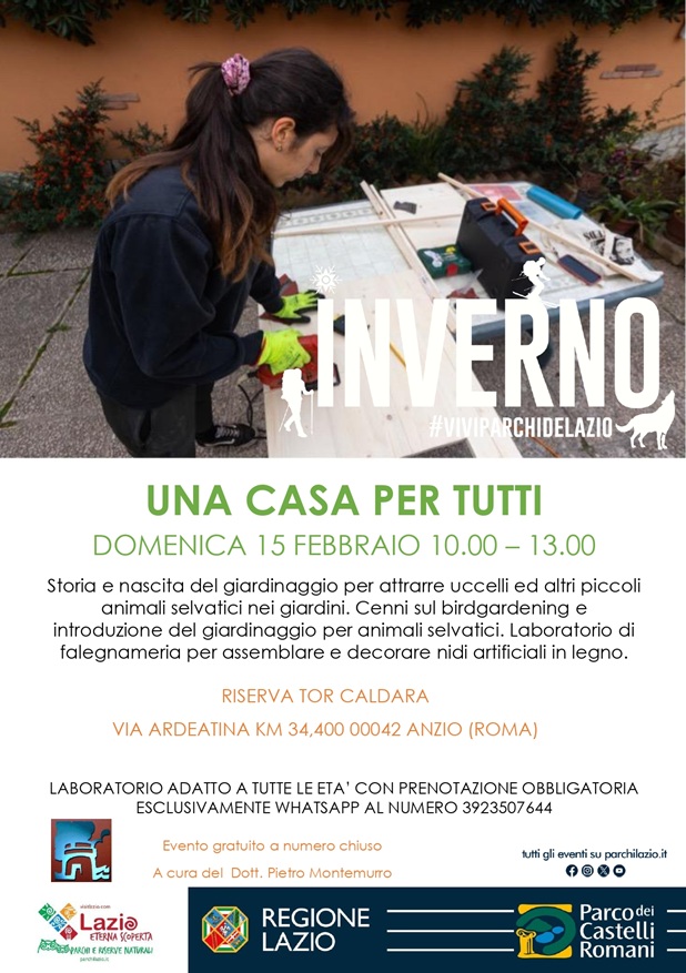 Domenica 15 febbraio dalle ore 10.00 alle 13.00, presso la Riserva di Tor Caldara ad Anzio (RM), un laboratorio adatto a tutte le età, a cura del dott. Pietro Montemurro, sarà incentrato sulla storia e la nascita del giardinaggio per attrarre uccelli e piccoli animali selvatici nei giardini e su come assemblare e decorare nidi artificiali in legno.