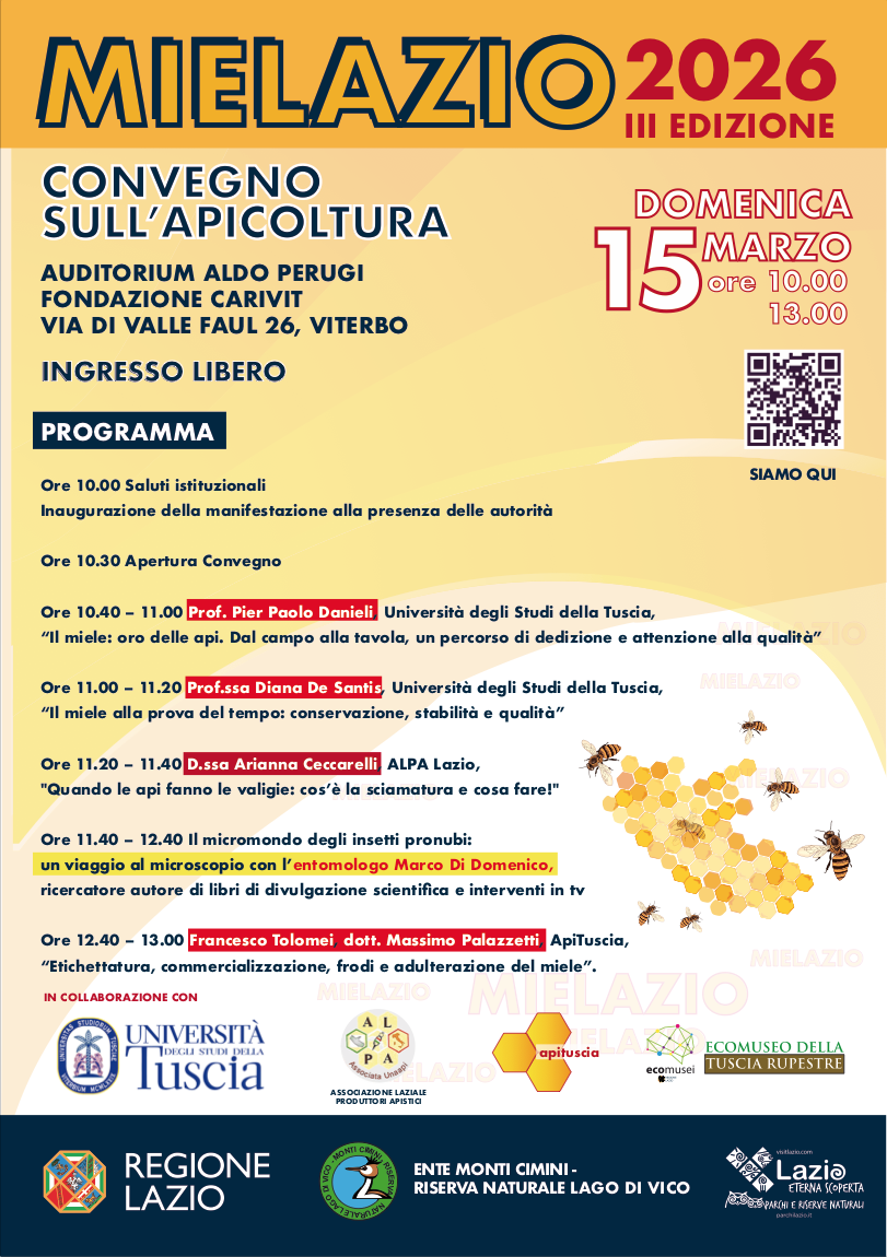 Nell'ambito della manifestazione, che si terrà a Viterbo, presso il Centro culturale della Fondazione Carivit, in Via di Valle Faul 24 - 26 (---> Raggiungi la località con il navigatore ) si terrà un convegno sui temi cari agli apicoltori, pensato per avere relatori di primissimo piano impegnati nella ricerca, didattica e attività professionale, ma con un taglio divulgativo.