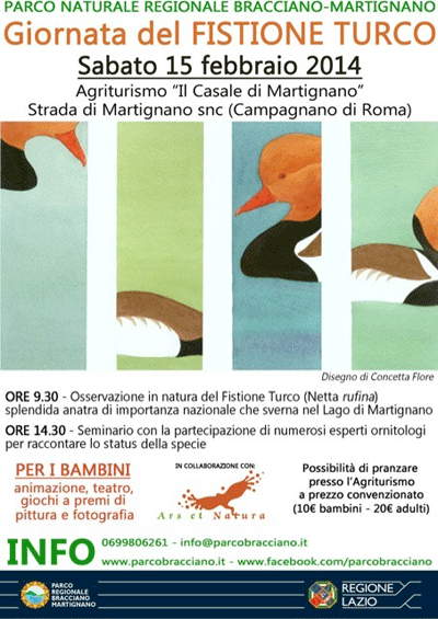 Sabato 15 febbraio, l'Agenzia Regionale per i Parchi partecipa al Workshop "Giornata di studio sul Fistione turco (Netta rufina) al Lago di Martignano" con un intervento dell'esperto Stefano Sarrocco dell'Area Biodiversità, Geodiversità e Reti ecologiche, dal titolo "Il Lago di Bolsena: sito di svernamento e nidificazione di Fistione turco (Netta rufina). Il workshop si svolge all'interno della manifestazione, organizzata dal Parco Naturale Bracciano-Martignano, che prevede momenti di animazione naturalistica per i bambini, incontri con gli esperti, giochi a premi. Programma Dalle ore 9.30 - Osservazione in natura del Fistione Turco (Netta rufina), splendida anatra di importanza nazionale che sverna nel Lago di Martignano. Dalle ore 14.30 - Workshop*: Giornata di studio sul Fistione turco (Netta rufina) al Lago di Martignano Per i bambini animazione, teatro, giochi a premi di pittura e fotografia Possibilità di pranzo presso l'Agriturismo a prezzo convenzionato (10€ bambini - 20€ adulti) *Programma: Il lago di Martignano, area di grande importanza naturalistica e paesaggistica, merita la qualifica di zona Ramsar? Dott. Paolo Giuntarelli (Direttore PNR Bracciano- Martignano); Trent’anni di censimenti ornitologici dei Laghi di Bracciano e Martignano Guido Baldi (Guardiaparco PNR Bracciano-Martignano); Invasione pacifica di Turchi (Fistioni) al Lago di Martignano Fabrizio Mantero (Guardiaparco PNR Bracciano Martignano), Emmanuelle Argenti (Servizio Naturalistico) Gli uccelli acquatici svernanti nel Lazio, 1991-2010 Dott. Massimo Brunelli (Sropu) Il Lago di Bolsena: sito di svernamento e nidificazione di Fistione turco (Netta rufina). Dott. Stefano Sarrocco (Agenzia Regionale Parchi) Il Fistione Turco: dal lago alla tela Dott. Marco Preziosi (AIPAN) Moderatore: Dott. Fulvio Fraticelli (Fondazione Bioparco di Roma)