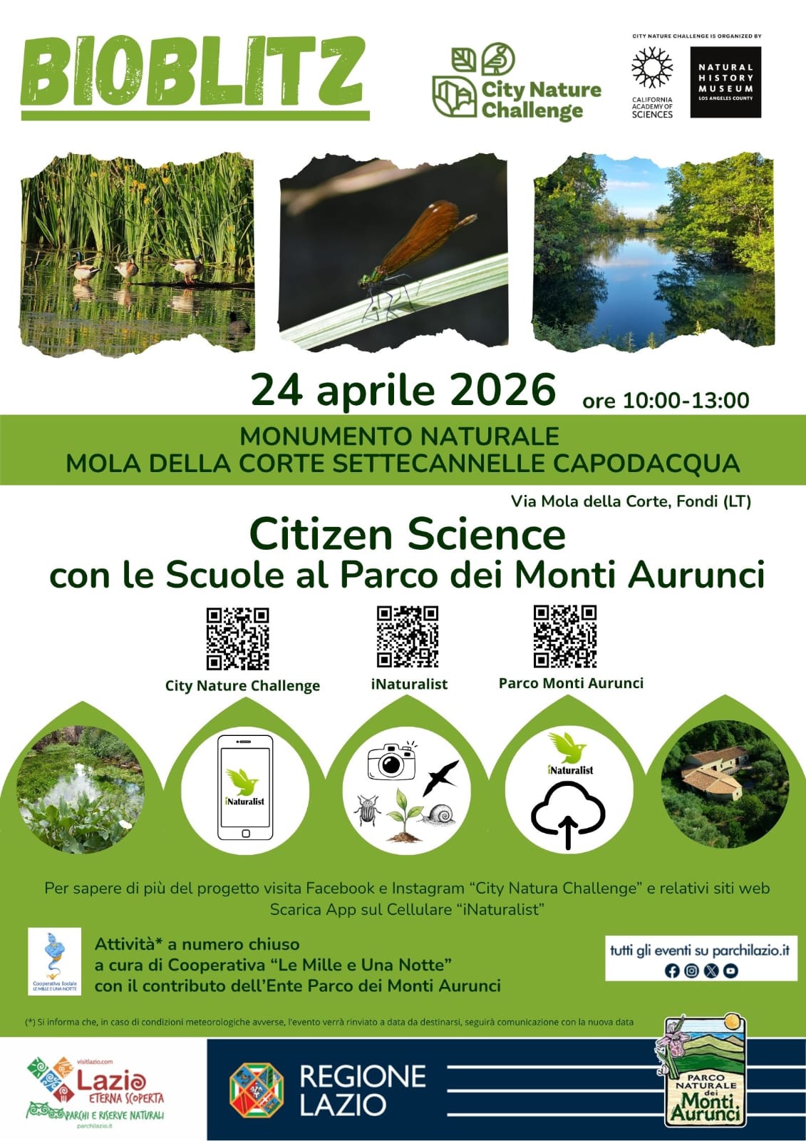Il Parco dei Monti Aurunci aderisce al City Nature Challenge 2026 con un Bioblitz dedicato alle scuole presso il Monumento Naturale Mola della Corte – Settecannelle – Capodacqua, per promuovere la conoscenza e la tutela della biodiversità.