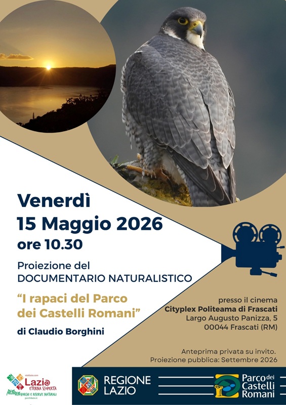 Venerdì 15 maggio presso il Cinema Cityplex – Politeama di Frascati, il Parco dei Castelli Romani presenterà in anteprima il documentario naturalistico “I rapaci del Parco dei Castelli Romani”, a cura del documentarista Claudio Borghini. La proiezione sarà riservata su invito, mentre la presentazione al pubblico è prevista per il mese di settembre 2026.