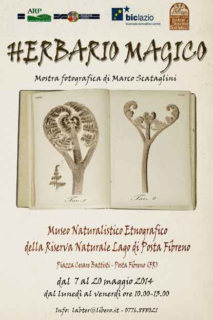 Dal 7 al 20 maggio il Museo Naturalistico Etnografico della Riserva Naturale Lago di Posta Fibreno ospiterà la mostra fotografica "Herbario Magico" di Marco Scataglini, in collaborazione con l'Agenzia Regionale per i Parchi. Attraverso le sue suggestive fotografie (alcune in 3D da visionare grazie ad appositi occhialini), l'autore racconta il legame tra la magia e la natura, il fascino degli antichi erbari e luoghi magici per eccellenza, i boschi. La mostra sarà aperta al pubblico dal lunedì al venerdì dalle ore 10.00 alle ore 13.00. Per informazioni: tel. 0761/634660.