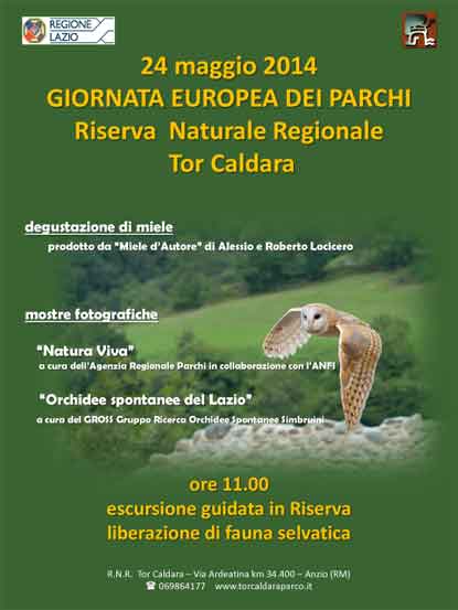 Sabato 24 maggio la Riserva Naturale Regionale Tor Caldara ospiterà la mostra fotografica "Natura Viva" realizzata dall'Agenzia Regionale per i Parchi in collaborazione con l'AFNI - Associazione Fotografi Naturalisti Italiani. Durante la giornata sarà possibile partecipare a diverse attività organizzate dalla Riserva in occasione della Giornata Europea dei Parchi.