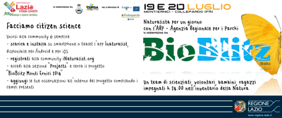 Sabato 19-domenica 20 luglio a Collepardo (FR) PROGRAMMA Tutti i partecipanti al BioBlitz, per intervenire alle attività di ricerca, devono registrarsi. E possibile farlo in questi giorni compilando la scheda di pre-iscrizione oppure nelle date del Bioblitz alla postazione "Informazioni & accoglienza" sita presso i giardini pubblici, all'ingresso del Paese. Qui è anche possibile ritirare il materiale per i rilievi e i campionamenti scientifici nonché incontrare gli esperti responsabili delle varie attività. Le aree sottoposte a campionamento e monitoraggio sono quattro: Selva d’Ecio, Ponte dei Santi, Grotte e abitato di Collepardo. Per raggiungere le diverse destinazioni è previsto un servizio navetta. Il Bioblitz si svolgerà con qualunque condizione meteo. SABATO 19 luglio 10:30 INIZIA L'ESPLORAZIONE! Comincia il BioBlitz 10:30-13:00 Che verso fai? Ascolto del canto degli uccelli. Funghi&Co. Alla ricerca delle specie presenti Cerco casa disperatamente. Posizionamento cassette nido per moscardini Alla scoperta del mondo vegetale. Campionamenti botanici. Con il ragno ci guadagno. I misteri degli ingegneri a otto zampe Cosa succede in città? Escursione alla scoperta della biodiversità urbana (Collepardo Gli inquilini del pian di sotto. Campionamento degli animali delle Grotte Elusivi, ma non troppo. Mammiferi click and go con le fototrappole (posizionamento) Erbavoglio. Passeggiata volta la riconoscimento delle piante officinali spontanee Green attack: i licheni, questi sconosciuti Pausa pasto 15:00-19:30 Il meraviglioso mondo dei sei zampe: campionamenti di insetti Funghi&Co. Alla ricerca delle specie presenti Cosa succede in città? Escursione alla scoperta della biodiversità urbana (Collepardo) Insetti di fiume: prendiamoli nella rete! Butterfly watching. Campionamenti di lepidotteri diurni Sulle tracce dei micro-mammiferi. Scopriamo di più su roditori e insettivori Chi l’ha “fatta”? Sulle tracce dei grandi vertebrati del bosco C'è vita nella pozza? Invito alla conoscenza di libellule, damigelle e altri invertebrati acquatici Binocolo pronto e orecchie tese: passeggiata ornitologica. Elusivi, ma non troppo. Mammiferi click and go con le fototrappole (posizionamento) Con il ragno ci guadagno. I misteri degli ingegneri a otto zampe Cerco casa disperatamente. Posizionamento cassette nido per moscardini “Sir Biss” e i suoi parenti. Cerchiamoli con l'esperto. Gli inquilini del pian di sotto. Campionamento degli animali delle Grotte Microcosmo. Le meraviglie dei piccolissimi SOS Bat-tata: come ti rimetto “in volo” un pipistrello Pausa pasto 20:00-00:30 La batracomiomachia: le “voci” degli anfibi Chi è attratto dalla luce? Attivazione fonti luminose e controllo della presenza di falene e altri insetti Con il ragno ci guadagno. I misteri degli ingegneri a otto zampe Siamo belli, siamo i pipistrelli. Bat counting con termocamera e analisi biacustica con Bat-detector, lo strumento in grado di rilevare gli ultrasuoni emessi dai pipistrelli Chi è attratto dalla luce? Attivazione fonti luminose e controllo della presenza di falene e altri insetti Ti ho preso! Controllo trappole fotografiche Quelli della notte. Utilizzo di termocamera per "vedere" gli animali nel buio Pausa Notturna DOMENICA 20 luglio 08:30-12.30 Aguzza l'orecchio. Censimenti di uccelli al canto Alla scoperta del mondo vegetale: campionamenti botanici Chi l’ha “fatta”? Sulle tracce dei grandi vertebrati del bosco Batracomiomachia: le “voci” degli anfibi Microcosmo. Le meraviglie dei piccolissimi Funghi&Co. Alla ricerca delle specie presenti Cosa succede in città? Escursione alla scoperta della biodiversità urbana (Collepardo) Funghi e non solo. Alla ricerca delle specie presenti Butterfly watching. Campionamenti di lepidotteri diurni Alla scoperta del mondo vegetale: campionamenti botanici Green attack: i licheni, questi sconosciuti Insetti di fiume: prendiamoli nella rete! Erbavoglio. Passeggiata volta la riconoscimento delle piante officinali spontanee Il meraviglioso mondo dei sei zampe: campionamenti di insetti FINE BIOBLITZ Cos'altro è possibile fare: le iniziative • Osservazioni al microscopio presso il Laboratorio da Campo allestito all'interno della Scuola Elementare di Collepardo. • Visite guidate al centro storico a cura dell'Ecomuseo di Collepardo (offerta libera). • Visite guidate alla Certosa di Trisulti a cura dell'Ecomuseo di Collepardo (offerta libera). • Visita al Giardino Botanico WWF di Collepardo. • Vista a Pozzo d'Antullo (ingresso 1 euro). • Visita alle Grotte di Collepardo fuori dagli orari indicati delle attività di ricerca e monitoraggio (ingresso adulti 6 euro). • Percorso officinale a cura del Professor Marco Sarandrea e dell'Associazione Hortus Hernicus. Nel paese di Collepardo, in prossimità del punto di accoglienza, è attrezzata un'area stands con prodotti gastronomici tipici, curata dai produttori di Natura In Campo. Il programma è in continuo aggiornamento, a breve altre informazioni, iniziative e "special events". Rimanete collegati!