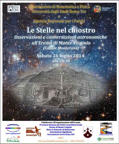 Sabato 26 luglio 2014 presso l'Eremo di Monte Virginio a Canale Monterano (RM) alle ore 20.30 si terrà l'evento "Le stelle nel chiostro". L'iniziativa organizzata dal Dipartimento di Matematica e Fisica dell'Università Roma Tre e dall'Agenzia Regionale per i Parchi del Lazio darà la possibilità a tutti i partecipanti di effettuare osservazioni astronomiche al telescopio e ad occhio nudo sotto la guida di esperti. La partecipazione all’evento è libera e gratuita, non è necessaria alcuna prenotazione, si consiglia di portare la cena al sacco, che potrà essere comodamente consumata nei giardini che circondano l'Eremo.