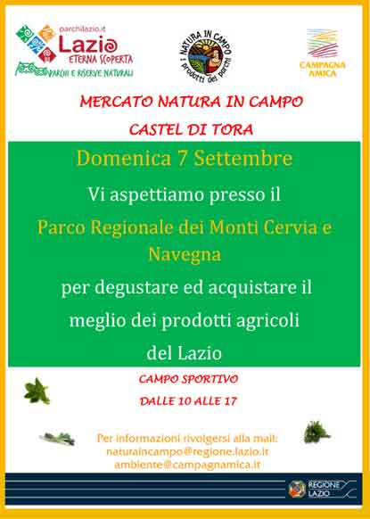 Domenica 7 settembre 2014, presso la Riserva Naturale Regionale Monte Navegna e Monte Cervia si terrà il mercato dei prodotti agricoli del Lazio. L'evento avrà luogo, dalle ore 10.00 alle ore 17.00, presso il Campo Sportivo a Castel di Tora (RI) . Per ulteriori informazioni mail: naturaincampo@regione.lazio.it